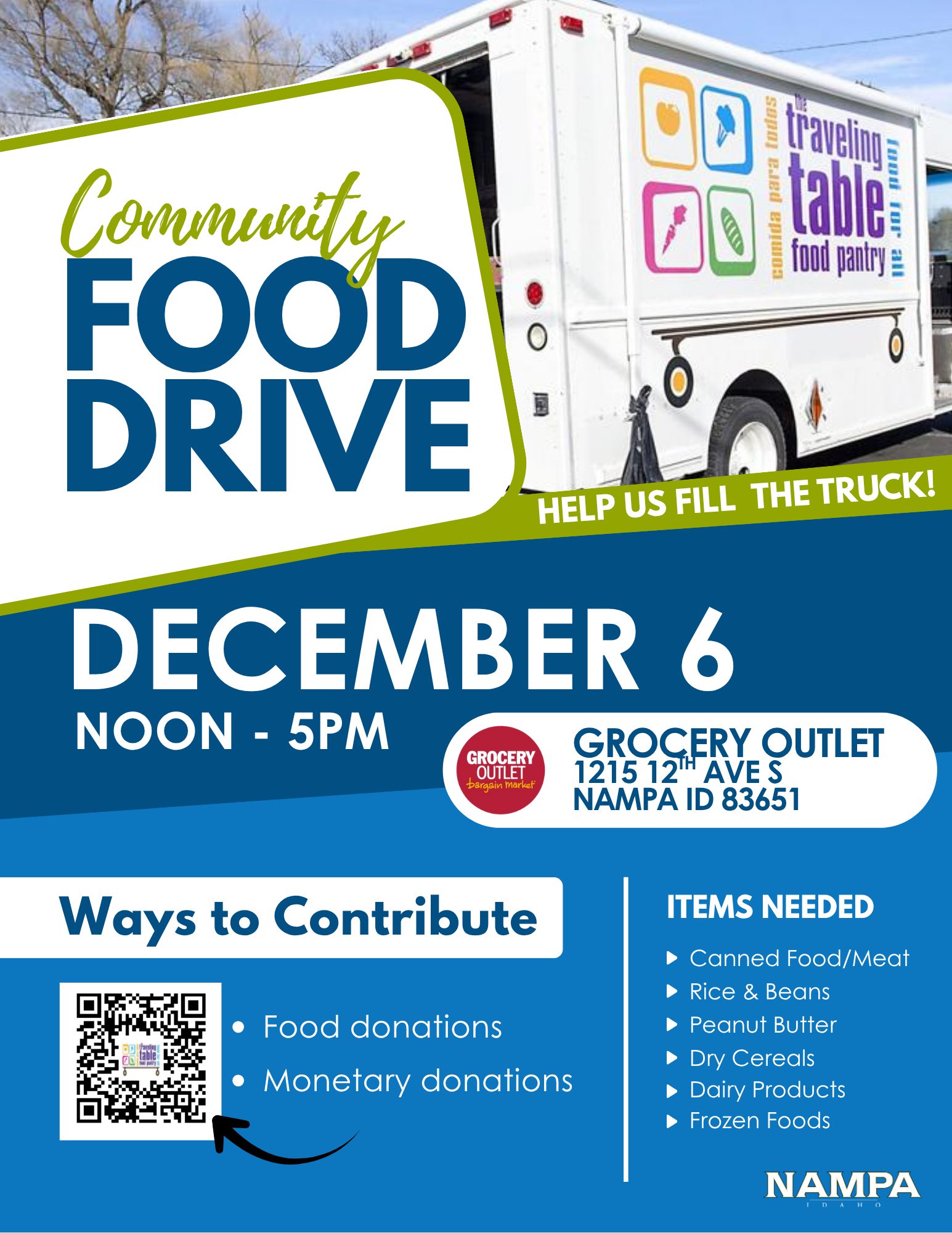 Help us fill the truck! Items needed: - Canned Food/Meat - Rice & Beans - Peanut Butter - Dry Cereals - Dairy Products - Frozen Foods