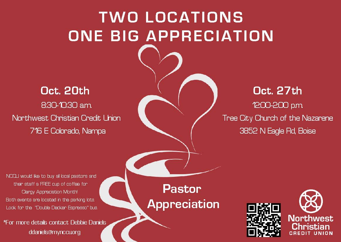 NW Christian Credit Union would like to buy ALL local pastors, spouses and their staff a cup of coffee from DOUBLE DECKER ESPRESSO to celebrate October National Clergy Appreciation Month! Please invite your pastor and staff... retired pastors are encouraged to come too!