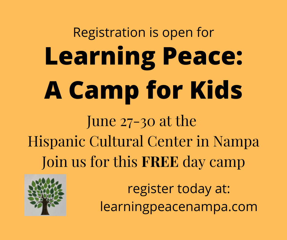 Registration is open for Learning Peace: A Camp for Kids. Camp will be June 27-30 from 9 AM-3PM at the Hispanic Cultural Center for youth ages 6-13. This day camp is FREE. Register at https://www.learningpeacenampa.com