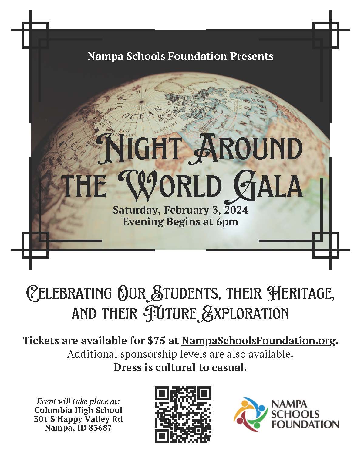 DESCRIPTION:Nampa Schools Foundation Presents: Night Around the World Gala on February 3\, 2024. This event celebrates our students\, their heritage\, and their future exploration. Tickets are $75 each www.nampaschoolsfoundation.org Sponsorship opportunities are available for local businesses. Appropriate dress is cultural to casual.