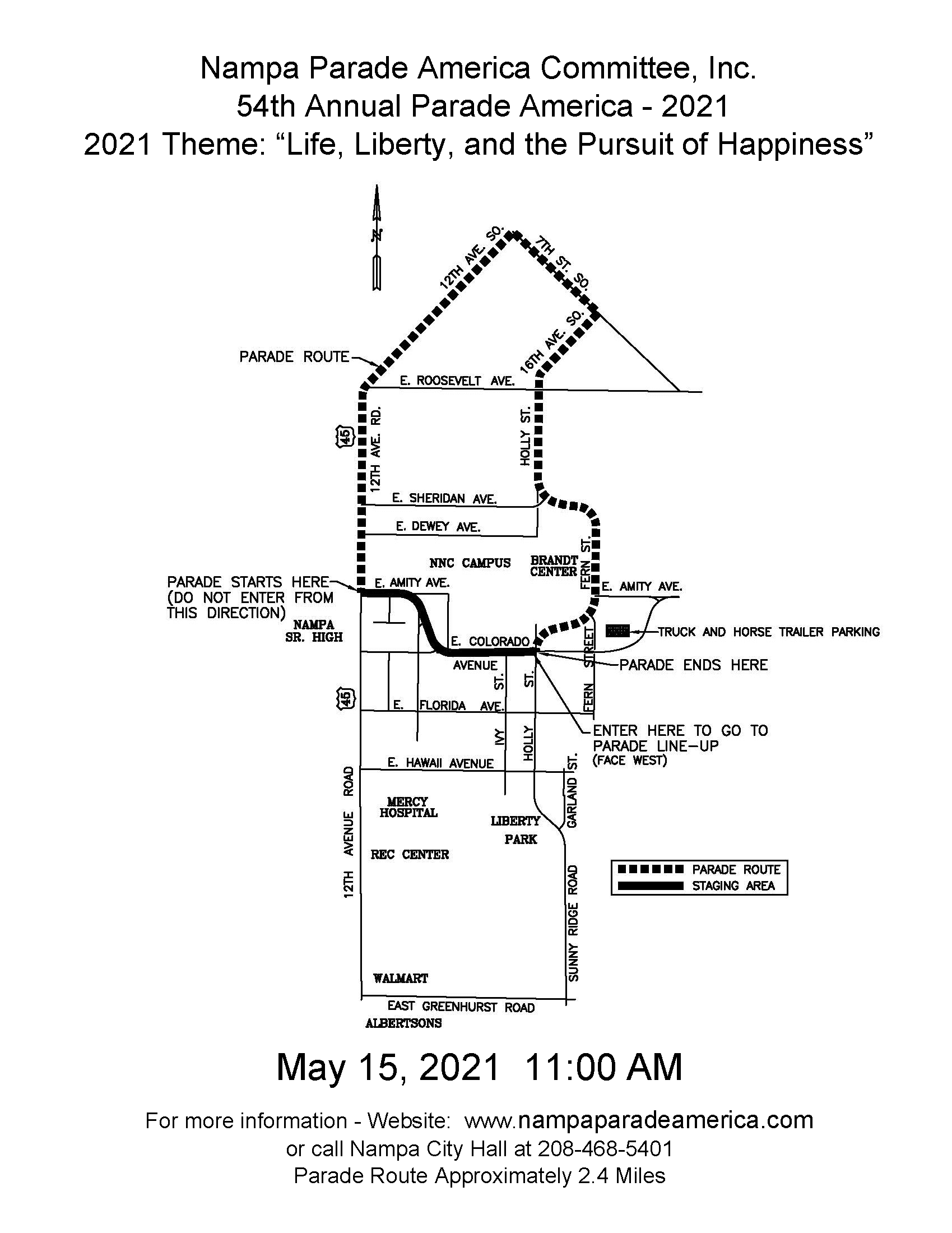 The Nampa Parade America Committee, Inc. invites the community to the 54th annual Parade America beginning at 11 a.m. Sat., May 15, 2021. The theme for this year’s annual patriotic event is “Life, Liberty, and the Pursuit of Happiness,” and includes floats, horses, marching bands, antique cars, and much more.