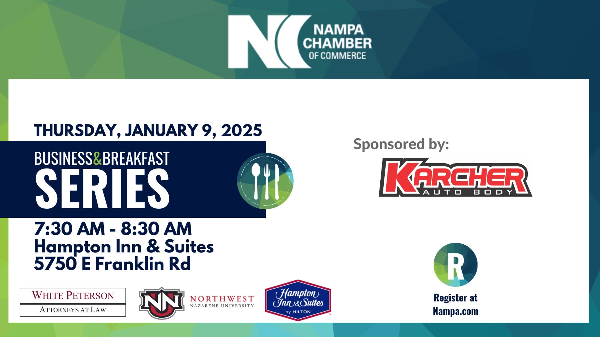 Thanks to the generosity of our sponsors, The Hampton Inn, White Peterson, and Northwest Nazarene University, Business & Breakfast is a free event for our members. RSVP is required.