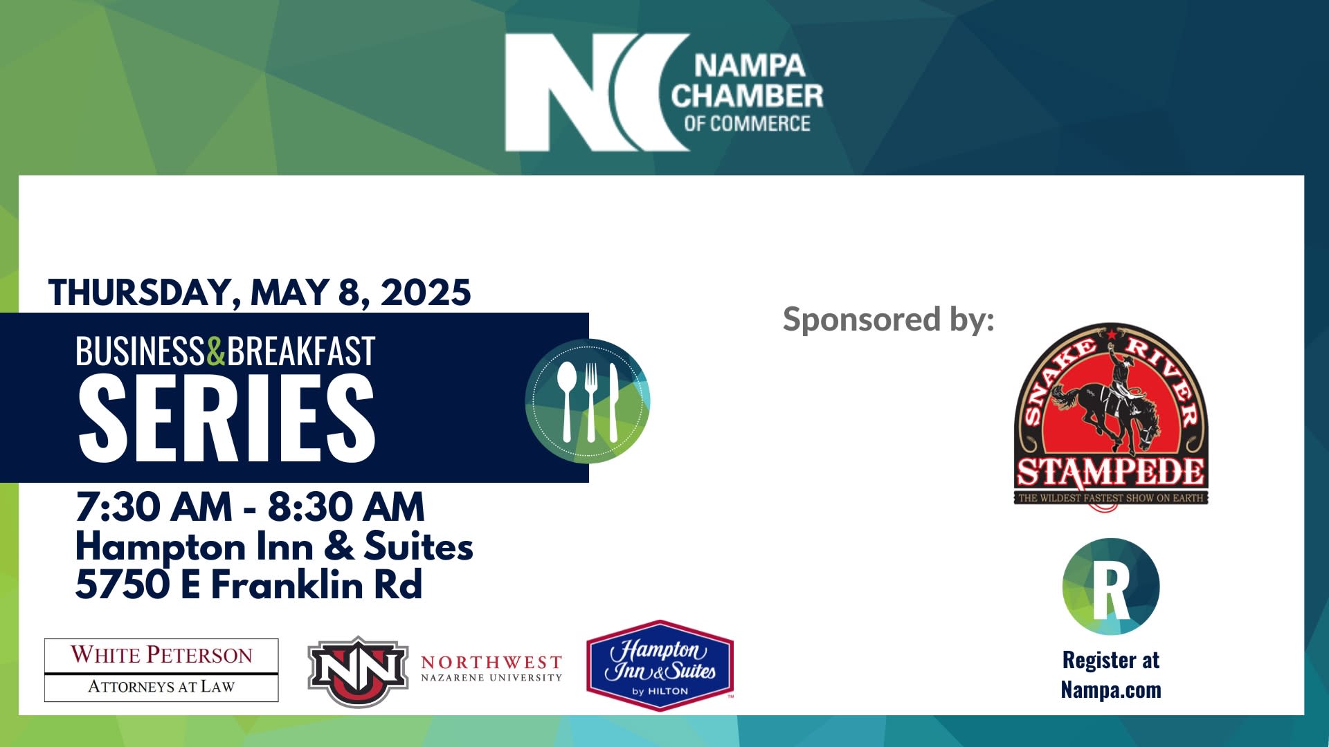 Thanks to the generosity of our sponsors, The Hampton Inn, White Peterson, and Northwest Nazarene University, Business & Breakfast is a free event for our members. RSVP is required.