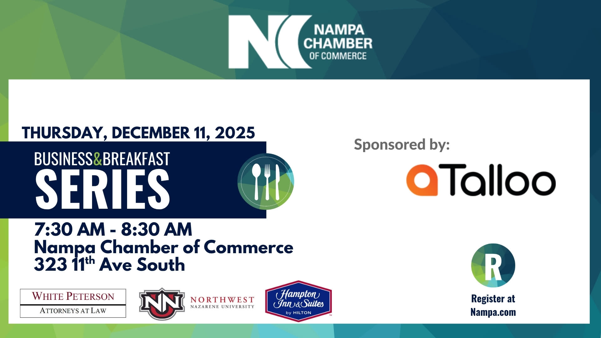 Please note: Business & Breakfast will be held at the Nampa Chamber in December due to availability at the Hampton Inn. We look forward to seeing you there!