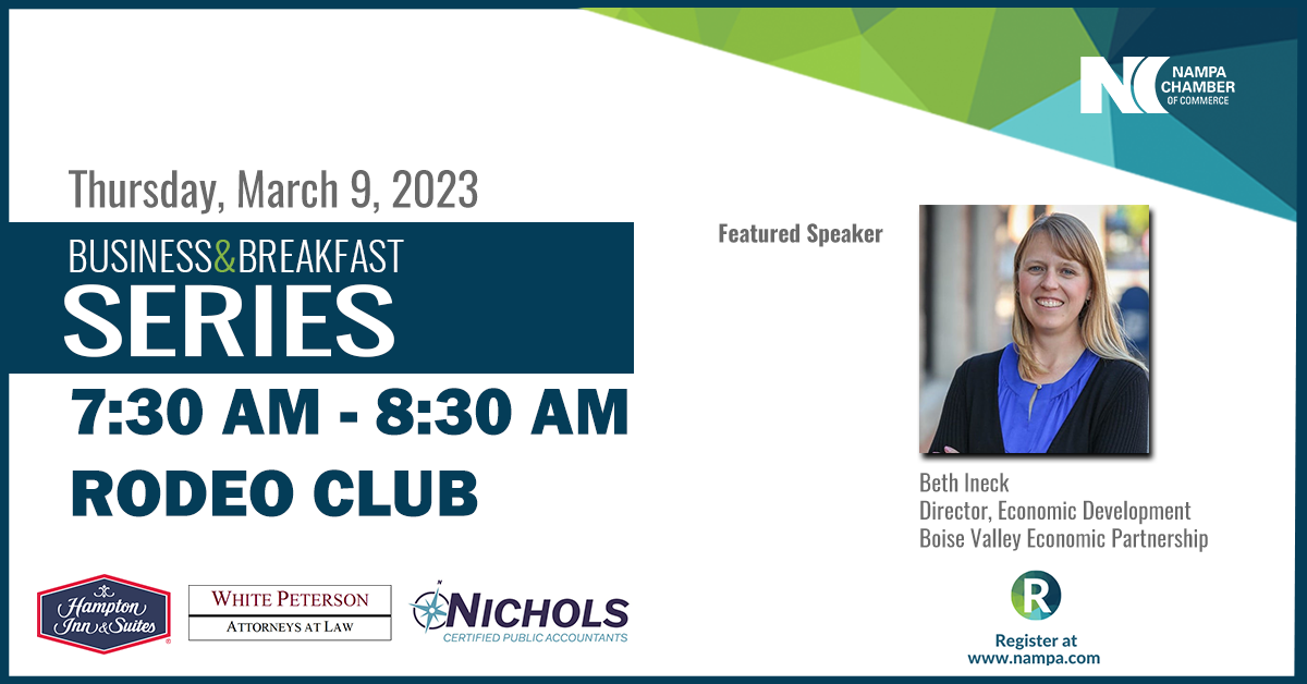 Our March Business & Breakfast speaker is Beth Ineck. Beth is formerly Nampa's Economic Development Director. She currently serves as the Director of Economic Development for the Boise Valley Economic Partnership (BVEP). Beth will be joined by the City of Nampa's Economic Development Analyst, Amber Bothwell.