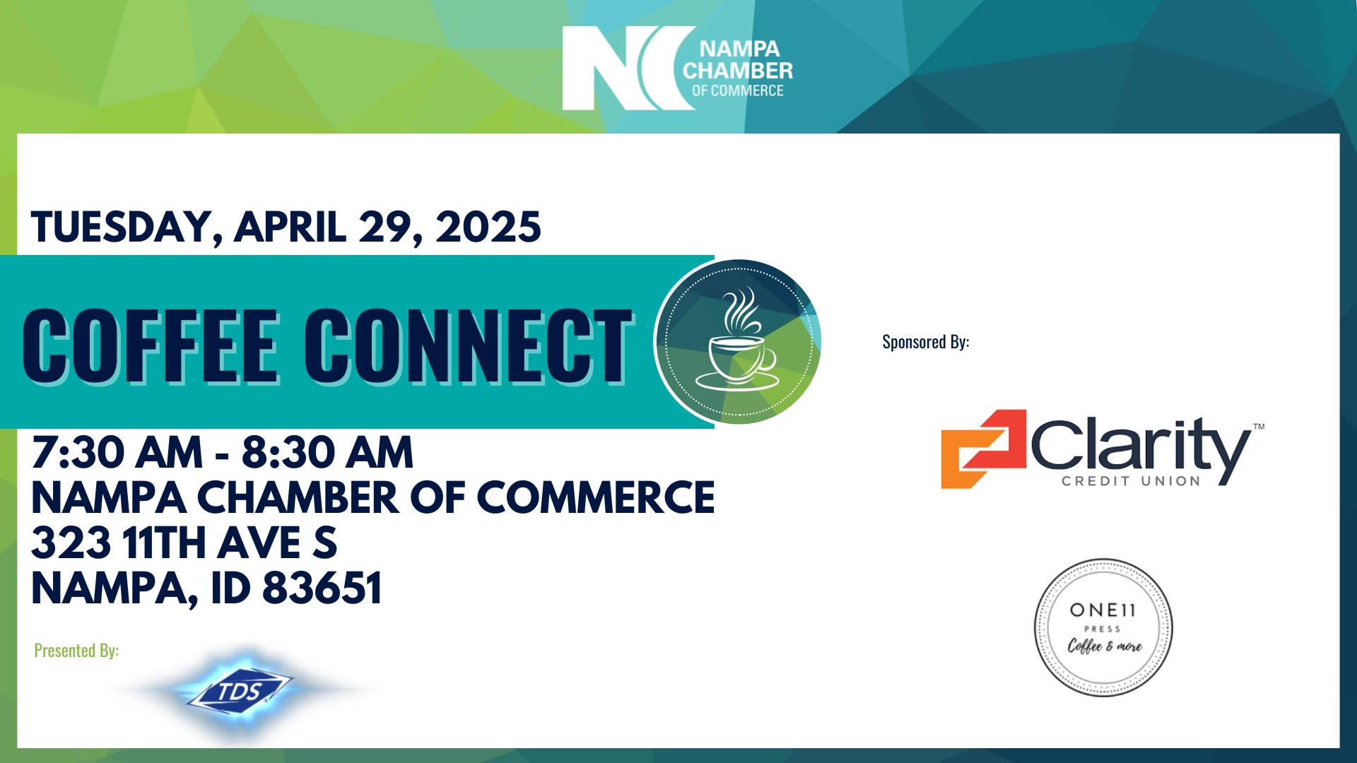 Thanks to our generous sponsors, Coffee Connect is free to our Nampa Chamber members. Future members can call the Chamber office to be added to the guest list.