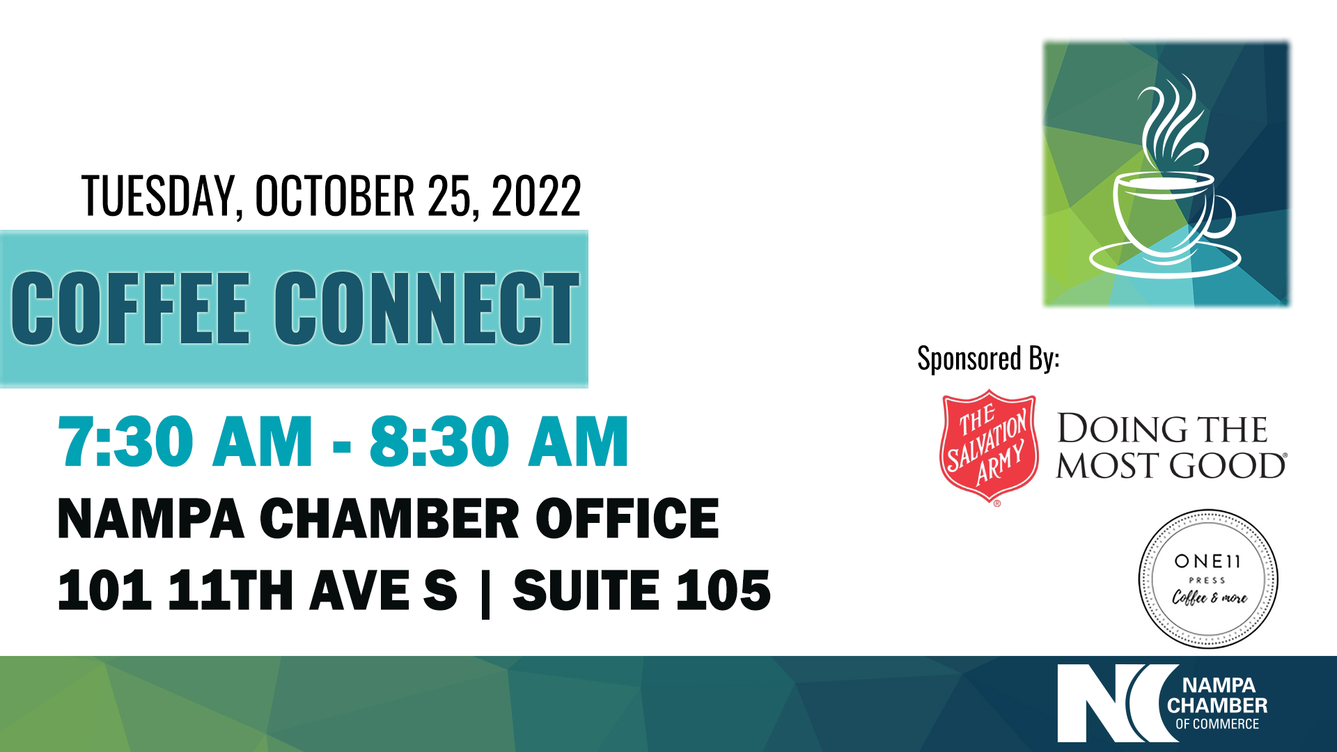 Join us for coffee and conversation. Connect with your Nampa Chamber board members, staff, and other chamber members. Discuss business issues, learn how to maximize your membership, and network. RSVP is appreciated but not required.