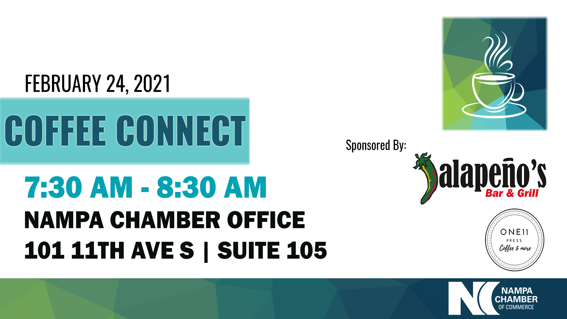 Your favorite networking event is back with a new name! Coffee on Us is now Coffee Connect. Join us for coffee and conversation. Connect with your Nampa Chamber board members, staff, and other chamber members. Discuss business issues, learn how to maximize your membership, and network.