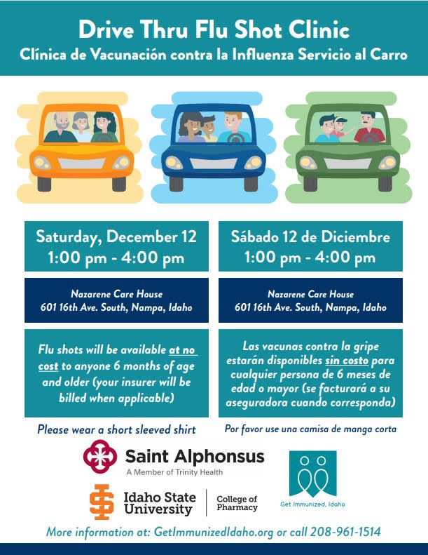 Flu shots will be available at no cost o anyone 6 months of age and older (your insurer will be billed when applicable.) Please wear a short-sleeved shirt. For more information visit GetImmunizedIdaho.org or call 208-961-1514.Images