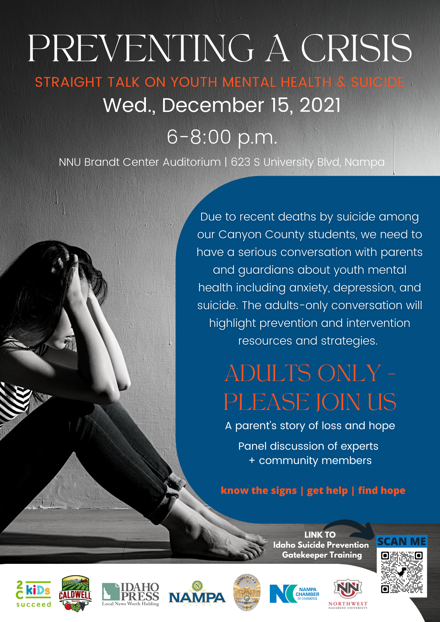 Due to recent deaths by suicide among our Canyon County students, we need to have a serious conversation with parents and guardians about youth mental health including anxiety, depression, and suicide. This adults-only conversation will highlight prevention and intervention resources and strategies. Please join us Wednesday, December 15th from 6-8:00 pm in the NNU Brandt Center Auditorium.
