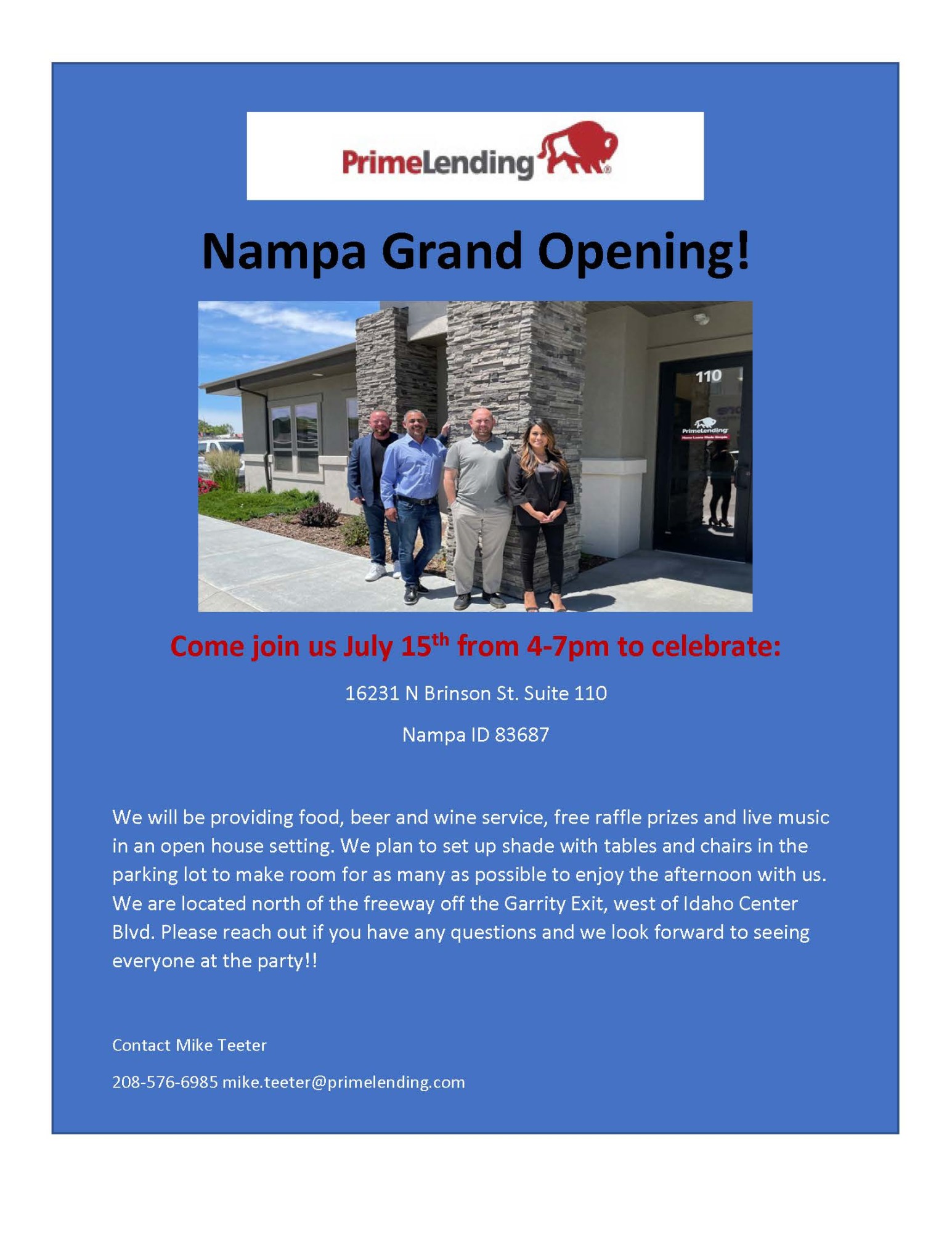 Join us to celebrate PrimeLending Nampa's NEW location! Join us for food, beer and wine service, live music, free raffle prizes, and lots of shade.