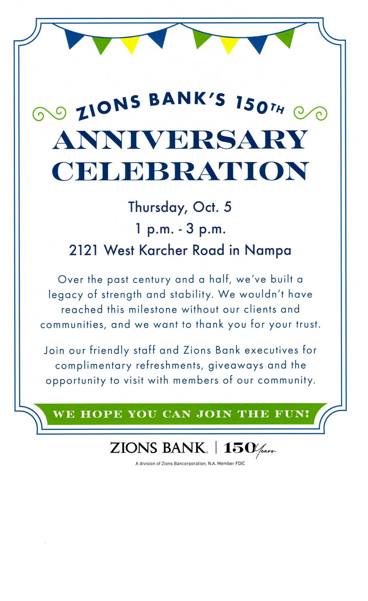 Join us as we celebrate Zion Bank's 150 years! Nampa Chamber members, ambassadors, and board members will host a ribbon cutting at their Karcher Road branch to celebrate with them.
