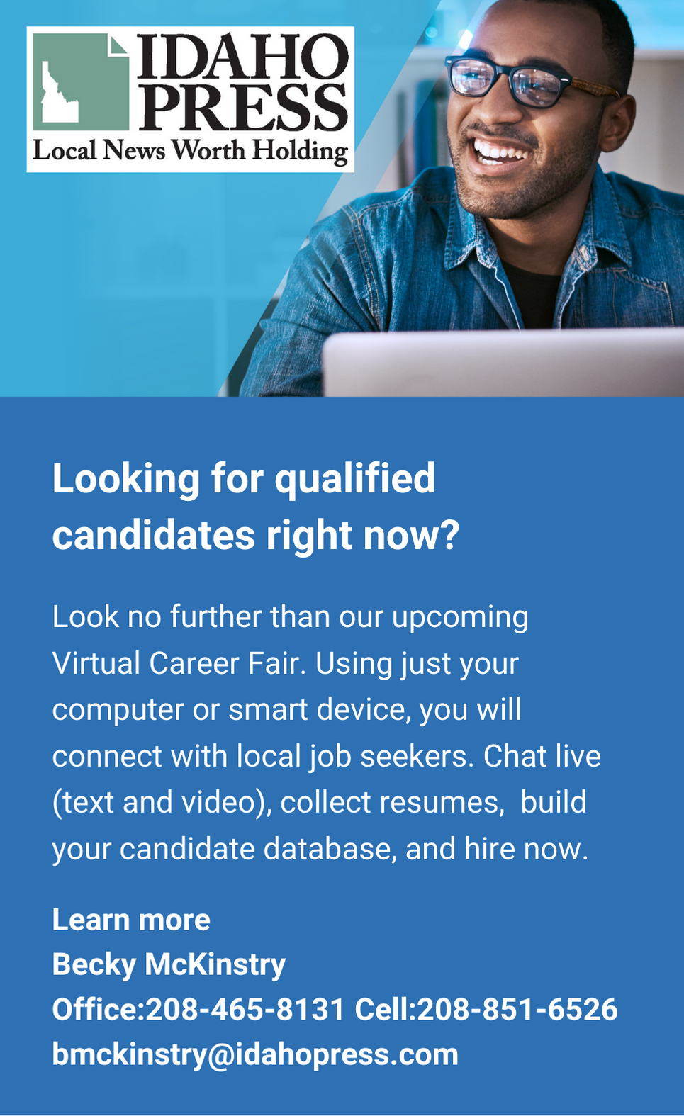 If you'd like more information about how to reserve your booth, contact us at bmckinstry@idahopress.com or (208) 465-8131. I look forward to sharing more information with you about the exciting recruiting event!